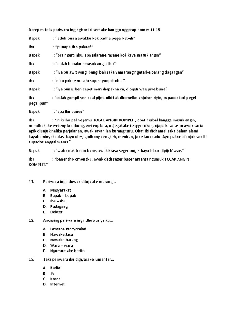 Mediya kang ngemot pariwara yaiku. Pariwara/iklan iku sawijining pesen babagan barang/jasa kang digawe dening produsen kang diandharake lumantar mediya (cetak, audio, elektronik) utawa papan panggonan umum kang ditujokake marang bebrayan agung. Pawarta kang ditujokake kanggo umum, kang surasane menehi pangerten tumrap sawijining prastawa diarani… lelayu. Ancase pariwara/iklan yaiku supaya masarakat kesengsem. Kadadean saka rong ukara kang dhapukane nganggo purwakanthi guru swara. Pilihan tembung lan ukara kudu bias narik kawigaten/menarik perhatian. Novel yaiku wujud karya sastra kang dumadi saka rong unsur, yaiku unsur intrinsik lan ekstrinsik kang kaloro unsur kasebut gegandhengan jalaran duweni daya pangaribawa gedhe kanggo nglairake karya sastra. Dan jutaan jawaban atas pertanyaan lain tanpa iklan. Cengkorongan panulise tanggap wacana kang surasane sawijining amanat utawa pesen kang dijlentrehake dening pamaos tanggap wacana yaiku …. Buku pr lks intan pariwara semester 1 dan 2 adalah buku pelajaran yang berisi ringkasan materi. Iklan/pariwara iku sawijining pesen babagan barang/jasa (produk) kang digawe dening produsen kang diandharake lumantar mediya (cetak,audio,elektronik) utawa papan panggonan umum kang 3. Ukarane cekak/singkat, aos/padat lan surasane cetha/jelas. Cengkorongan panulise tanggap perihal kang surasane sawijining amanat utawa pesen kang dijlentrehake dening pamaos tanggap perihal yaiku ….