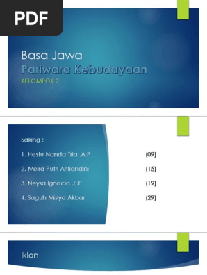 Surasane Pariwara Yaiku A Subyektipb Basane Ngambra Ambrac Dudut Atid Digawe Gawe Brainly Co Id from id-static.z-dn.net Kali ini kang yusuf ingin berbagi tips mengenai dunia pendidikan dengan topik lks intan pariwara. Mediya kang ngemot pariwara yaiku. Kang klebu media cetak umpamane lumantar majalah, koran, tabloid, brosur lan sakpanunggalane. Kang isih dadi tanggunganmu ibu. Iklan iku wujude ana 2, yaiku Ancase pariwara/iklan yaiku supaya masarakat kesengsem. Aweha panemu tumrap andharan wos surasane iklan kang dijlentrehake dening kancamu? Wos surasane geguritan ing dhuwur yaiku … 15.