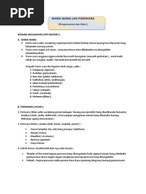 Pariwara kang wujude pawarta ( berita ) iku diarani advertorial. Adate sipat kaya mangkene iki thukul marga kasurung dening ati drengki srei. Apa wae kang ana sambung rakete karo produk, ing. Terjawab • terverifikasi oleh ahli. Sebutke bab kang perlu digatekake nalika gawe pariwara!